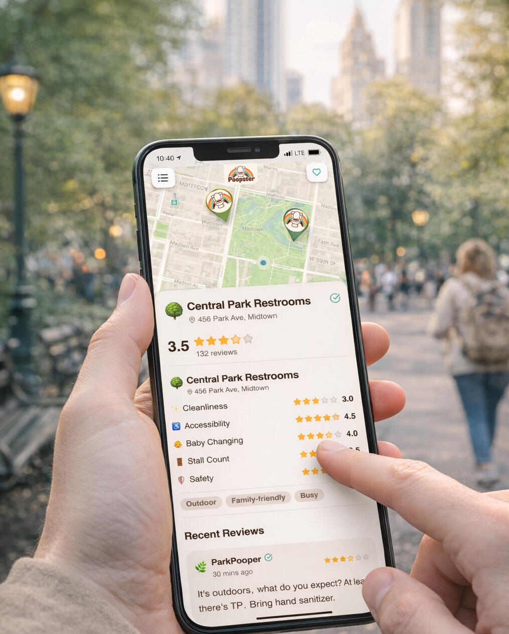 Poopster helps you find the best public bathrooms nearby — rated for cleanliness, safety, accessibility, and amenities like changing stations and privacy.